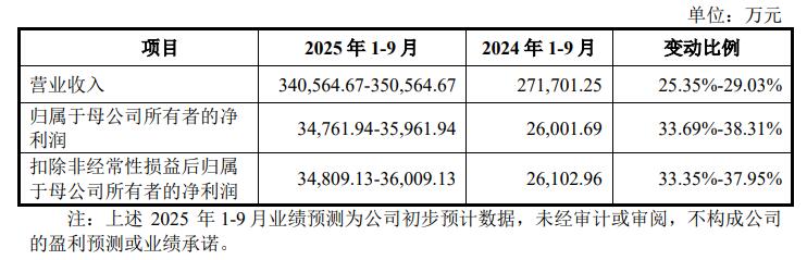 友升股份预计2025年1-9月实现营业收入340,564.67万元至350,564.67万元,同比增长25.35%至29.03%;归属于母公司所有者的净利润34,761.94万元至35,961.94万元,同比增长33.69%至38.31%;扣除非经常性损益后归属于母公司所有者的净利润34,809.13万元至36,009.13万元,同比增长33.35%至37.95%。