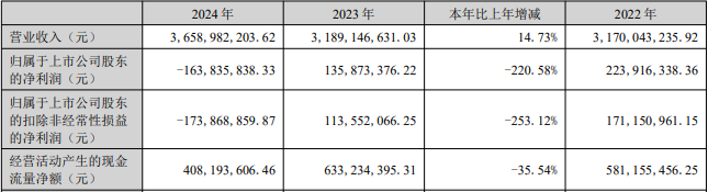 2024年,美利信实现营业收入36.59亿元,同比增长14.73%;归属于上市公司股东的净利润-1.64亿元,同比减少220.58%;归属于上市公司股东的扣除非经常性损益的净利润-1.74亿元,同比减少253.12%;经营活动产生的现金流量净额4.08亿元,同比减少35.54%。