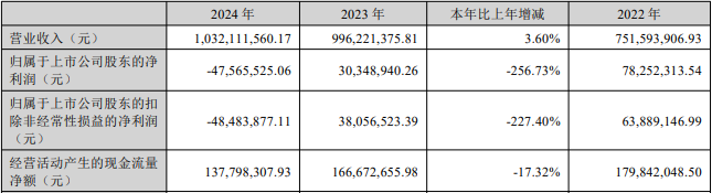 2024年,公司实现营业收入10.32亿元,同比增长3.60%;归属于上市公司股东的净利润-4756.55万元,同比减少256.73%;归属于上市公司股东的扣除非经常性损益的净利润-4848.39万元,同比减少227.40%;经营活动产生的现金流量净额1.38亿元,同比减少17.32%。