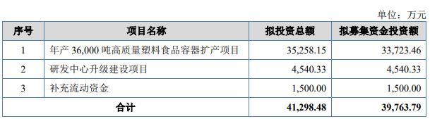 新天力拟募集资金39,763.79万元,用于年产36,000吨高质量塑料食品容器扩产项目、研发中心升级建设项目、补充流动资金。