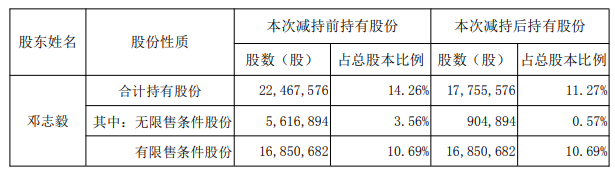 近日,公司收到邓志毅出具的《股票交易进展告知函》,获悉其于2025年9月15日至2025年9月23日期间通过集中竞价、大宗交易方式累计减持公司股份3,833,600股,占公司总股本的2.43%,权益变动触及1%整数倍。截至公告披露日,邓志毅的股份减持计划已实施完毕。