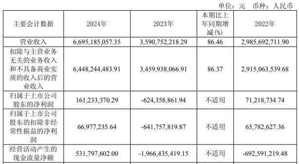 2023年、2024年,佰维存储归属于上市公司股东的净利润分别为-6.24亿元、1.61亿元,归属于上市公司股东的扣除非经常性损益的净利润分别为-6.42亿元、0.67亿元。