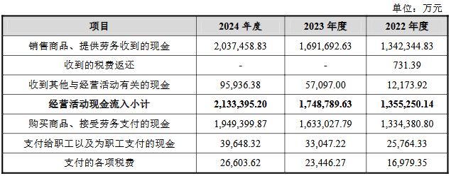 上述同期,公司经营活动产生的现金流量净额分别为-62,788.81万元、-37,457.13万元、16,447.59万元,销售商品、提供劳务收到的现金分别为1,342,344.83万元、1,691,692.63万元、2,037,458.83万元。