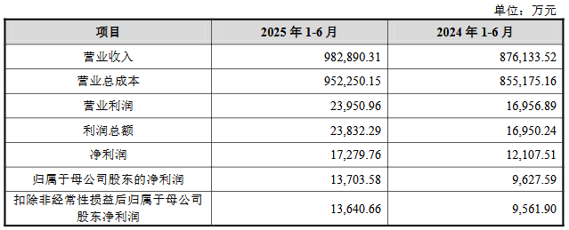 2025年1-6月,公司营业收入982,890.31万元,归属于母公司股东的净利润13,703.58万元,扣除非经常性损益后归属于母公司股东净利润13,640.66万元,经营活动产生的现金流量净额-13,917.42万元。