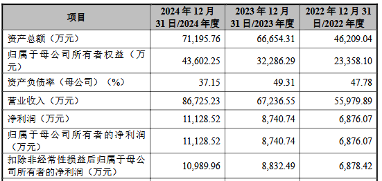 2022年至2024年,公司实现营业收入分别为55,979.89万元、67,236.55万元、86,725.23万元,归属于母公司所有者的净利润分别为6,876.07万元、8,740.74万元、11,128.52万元,扣除非经常性损益后归属于母公司所有者的净利润分别为6,878.42万元、8,832.49万元、10,989.96万元。