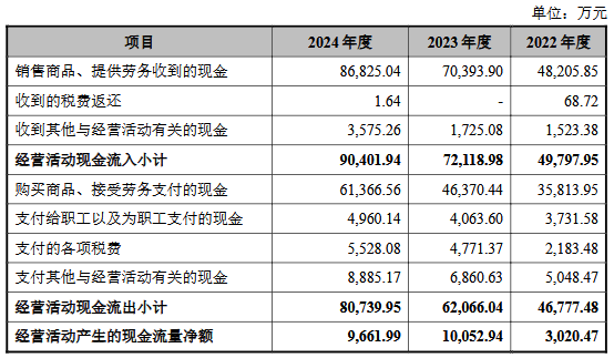 上述同期,公司经营活动产生的现金流量净额分别为3,020.47万元、10,052.94万元、9,661.99万元,销售商品、提供劳务收到的现金分别为48,205.85万元、70,393.90万元、86,825.04万元。