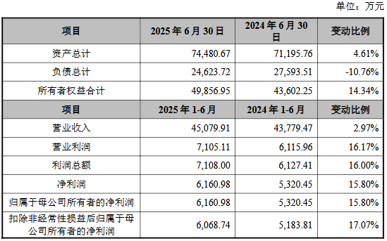 2025年1-6月,公司营业收入为45,079.91万元,同比增长2.97%;归属于母公司所有者的净利润为6,160.98万元,同比增长15.80%;扣除非经常性损益后归属于母公司所有者的净利润6,068.74万元,同比增长17.07%。