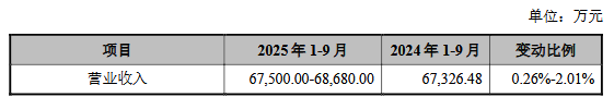 2025年1-9月,公司预计营业收入67,500.00万元至68,680.00万元,变动比例0.26%至2.01%;归属于母公司所有者的净利润9,200.00万元至9,500.00万元,变动比例0.83%至4.12%;扣除非经常性损益后归属于母公司所有者的净利润9,107.76万元至9,407.76万元,变动比例1.50%至4.84%。