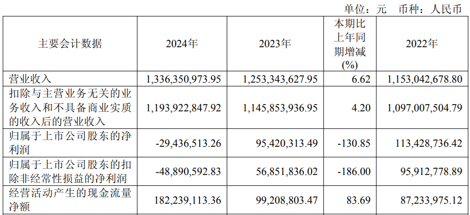 2024年,长阳科技实现营业收入13.36亿元,同比增长6.62%;归属于上市公司股东的净利润-2943.65万元,上年为9542.03万元;归属于上市公司股东的扣除非经常性损益的净利润-4889.06万元,上年为5685.18万元;经营活动产生的现金流量净额为1.82亿元,同比增长83.69%。