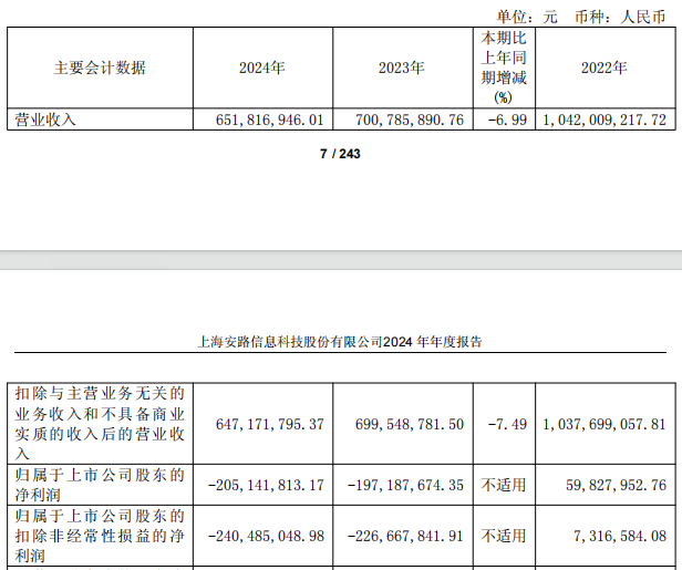 2024年,安路科技实现营业收入65,181.69万元,同比减少6.99%;归属于母公司所有者的净利润为-20,545.85万元,上年同期为-19,718.77万元;归属于母公司所有者的扣除非经常性损益的净利润为-24,068.17万元,上年同期为-22,666.78万元。