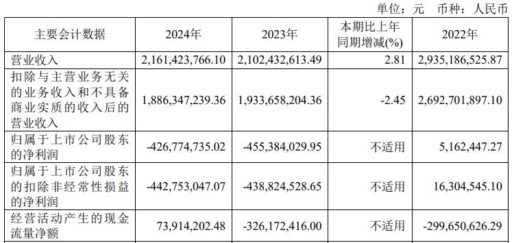 2024年,公司实现营业收入21.61亿元,同比增长2.81%;归属于上市公司股东的净利润-4.27亿元,上年同期为-4.55亿元;归属于上市公司股东的扣除非经常性损益的净利润-4.43亿元,上年同期为-4.39亿元;经营活动产生的现金流量净额7391.42万元,上年同期为-3.26亿元。
