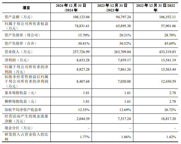 据公司招股书数据,过去7年,云汉芯城营业收入在2022年登顶,净利在2021年达峰。2018年至2024年,云汉芯城营业收入分别为93,654.45万元、82,708.24万元、153,385.37万元、383,563.00万元、433,319.83万元、263,709.04万元、257,726.99万元,净利润分别为125.70万元、-3,059.96万元、3,079.14万元、16,086.86万元、13,541.19万元、7,859.17万元、8,833.28万元,归属于母公司所有者的净利润分别为91.85万元、-3,042.77万元、3,082.12万元、16,121.00万元、13,563.44万元、7,861.26万元、8,827.28万元,扣除非经常性损益后归属于母公司所有者的净利润分别为2,860.47万元、-3,748.98万元、2,426.55万元、15,316.68万元、12,430.59万元、7,020.08万元、8,407.68万元。