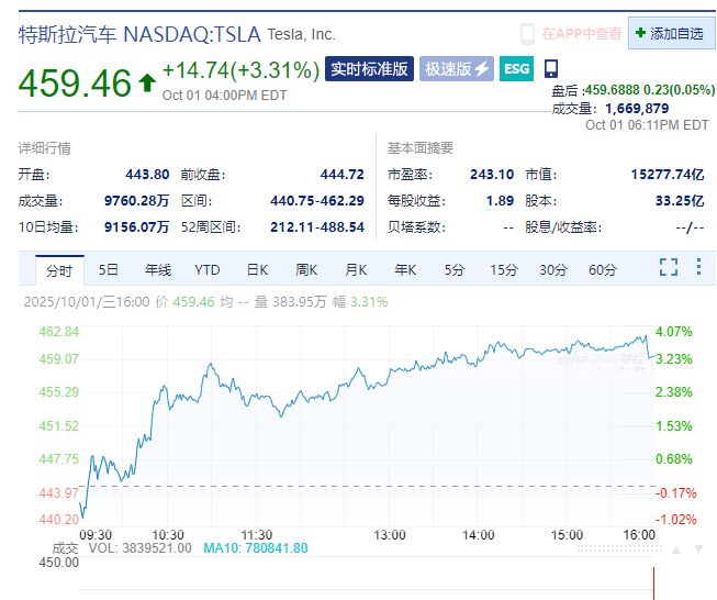特斯拉报459.46美元,涨3.31%,最新市值1.53万亿美元,其市值一夜增加490亿美元(约合人民币3489亿元)。
