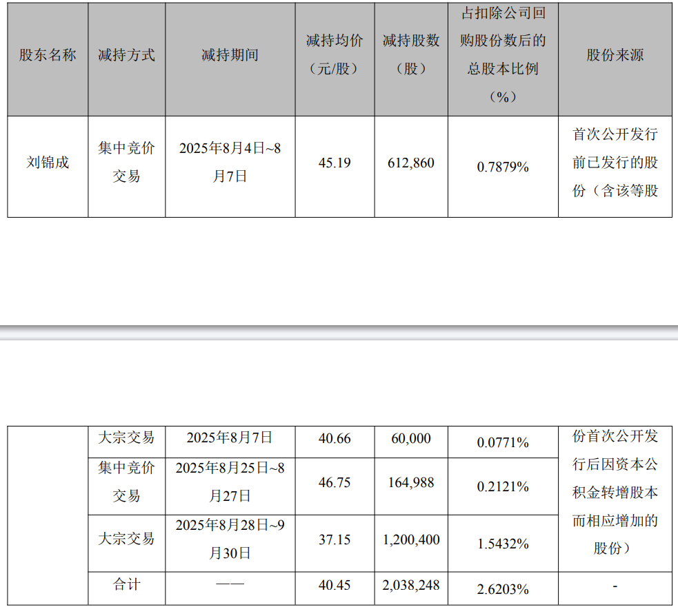 根据公告披露的减持均价40.45元/股计算,刘锦成本次减持套现约8244.71万元。