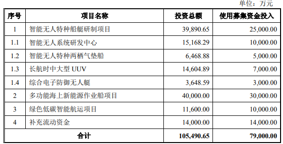 据天海防务2023年8月26日披露的2022年度向特定对象发行股票预案(修订稿) 显示,本次向特定对象发行募集资金总额不超过人民币79,000.00万元(含本数),扣除发行费用后的募集资金净额将用于以下项目:智能无人特种船艇研制项目、多功能海上新能源作业船项目、绿色低碳智能航运项目和补充流动资金。