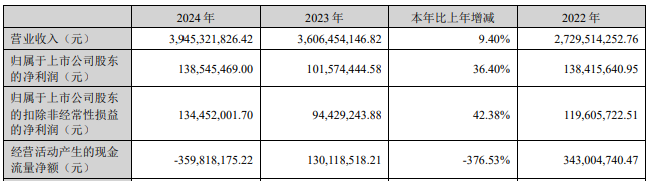 2024年,天海防务营业收入为39.45亿元,归属于上市公司股东的净利润为1.39亿元,归属于上市公司股东的扣除非经常性损益的净利润为1.34亿元,经营活动产生的现金流量净额为-3.60亿元。