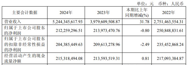 2024年,柏诚股份实现营业收入52.44亿元,同比增长31.78%;归属于上市公司股东的净利润2.12亿元,同比下降0.80%;归属于上市公司股东的扣除非经常性损益的净利润2.04亿元,同比下降2.49%;经营活动产生的现金流量净额2.15亿元,同比增长0.81%。