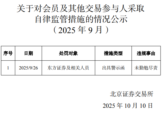 中国经济网北京10月14日讯 北交所网站近日披露的关于对会员及其他交易参与人采取自律监管措施的情况公示(2025年9月)显示,北交所对东方证券(600958.SH,03958.HK)及相关人员出具警示函,违规事由为未勤勉尽责。