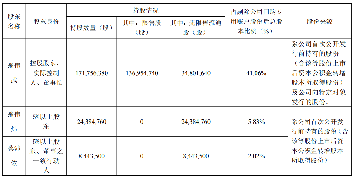 公告显示,翁伟武为英联股份控股股东、实际控制人,翁伟炜为持股5%以上股东,蔡沛侬为5%以上股东、董事之一致行动人。翁伟武、柯丽婉、许雪妮为一致行动人,翁伟炜、翁伟博为一致行动人,翁伟嘉、蔡沛侬为一致行动人。