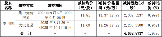 2025年9月5日至2025年9月26日,李卫国通过集中竞价交易方式减持2,382.5237万股,减持均价为11.81元/股;2025年8月29日至2025年10月10日,李卫国通过大宗交易方式减持2,250.3500万股,减持均价为11.69元/股。