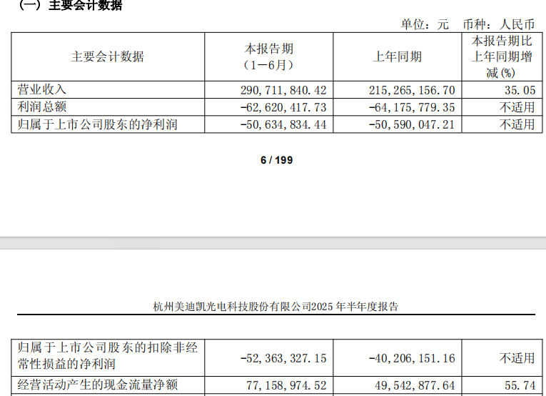 中国经济网北京10月16日讯 美迪凯(688079.SH)日前发布2025年半年度报告。今年上半年,公司实现营业收入2.91亿元,同比增长35.05%;归属于上市公司股东的净利润-5063.48万元;归属于上市公司股东的扣除非经常性损益的净利润-5236.33万元;经营活动产生的现金流量净额7715.90万元。