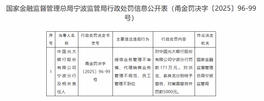 光大银行宁波分行被罚171万 授信业务管理不审慎等
