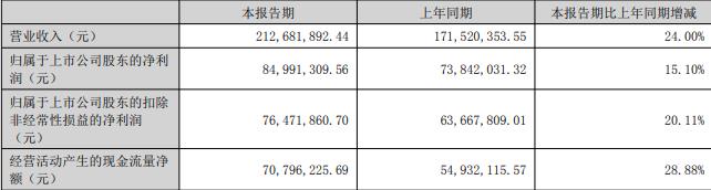 据公司2025年半年报,报告期内,公司实现营业收入2.13亿元,同比增长24.00%;归属于上市公司股东的净利润8499.13万元,同比增长15.10%;扣除非经常性损益后的净利润7647.19万元,同比增长20.11%;经营活动产生的现金流量净额7079.62万元,同比增长28.88%。
