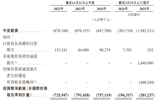 2022年、2023年、2024年及2025年一季度,斑马智行收入分别为8.05亿元、8.72亿元、8.24亿元、1.36亿元,年度亏损分别为8.78亿元、8.76亿元、8.47亿元、15.82亿元,经调整净亏损(非国际财务报告准则计量)分别为7.26亿元、7.92亿元、7.57亿元、2.01亿元。