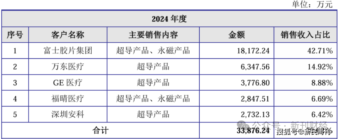 报告期内(2022年至2024年),健信超导向前五大客户销售额分别为2.65亿元、3.46亿元与3.39亿元,占比分别为73.75%、76.68%与79.62%(详见下表),占比逐期提升,显示出对前五大客户的高度依赖: