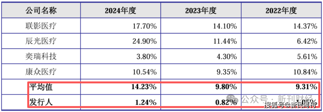 招股说明书显示,公司三项费用率即销售费用率、管理费用率以及研发费用率均大幅低于同行业上市企业(联影医疗、辰光医疗、奕瑞科技和康众医疗),我们先来看销售费用率,如下表所示: