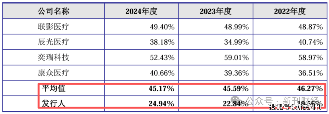 报告期公司研发费用一直徘徊在6%左右,而四家同行业上市公司同期除辰光医疗2022年研发费用率在6.43%之外,其余年份都是在10%以上,辰光医疗2024年研发费用率就飙升到24.74%的超高水平。研发费用率低,说明公司在研发上投入不足,公司产品竞争力弱,直接体现就是毛利率水平低于同行业上市企业,如下表所示: