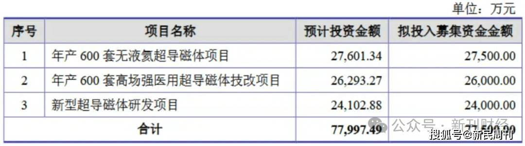 公司本次IPO拟募集资金总额8.65亿元,公司本次募集资金投资项目中包括“年产600套高场强医用超导磁体技改项目”和“年产600套无液氦超导磁体项目”,项目完成后预计将新增600台/年超导磁体产能、600台/年无液氦超导磁体产能,公司超导磁体总产能预计将达到1,500台/年,详见下表: