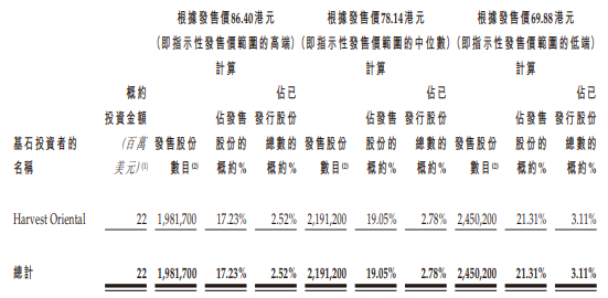 海西新药的基石投资者为Harvest Oriental。Harvest Oriental为于2024年10月成立的基金。Harvest International Premium Value (Secondary Market) Fund SPC acting on behalf of and for the account of Harvest Oriental为一家于开曼群岛成立的独立投资组合公司,并为一名独立第三方。嘉实国际资产管理有限公司及嘉实国际投资有限公司分别持有Harvest International Premium Value (Secondary Market) Fund SPC的91%及9%管理股份。