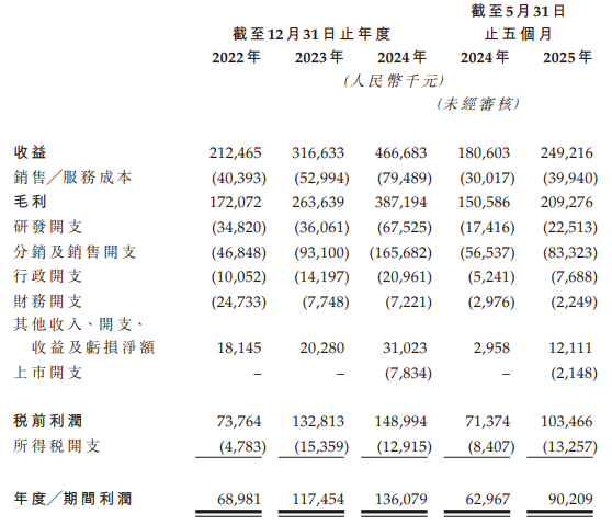 2022年、2023年、2024年、2025年1-5月,海西新药的收益分别为212.5百万元、316.6百万元、466.7百万元及249.2百万元;净利润分别为69.0百万元、117.5百万元、136.1百万元及90.2百万元。