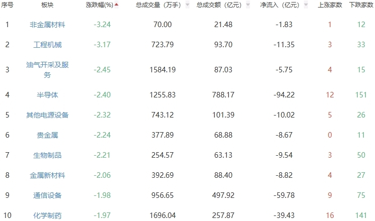 板块方面,煤炭开采加工、影视院线、港口航运等板块涨幅居前,非金属材料、工程机械、油气开采及服务等板块跌幅居前。