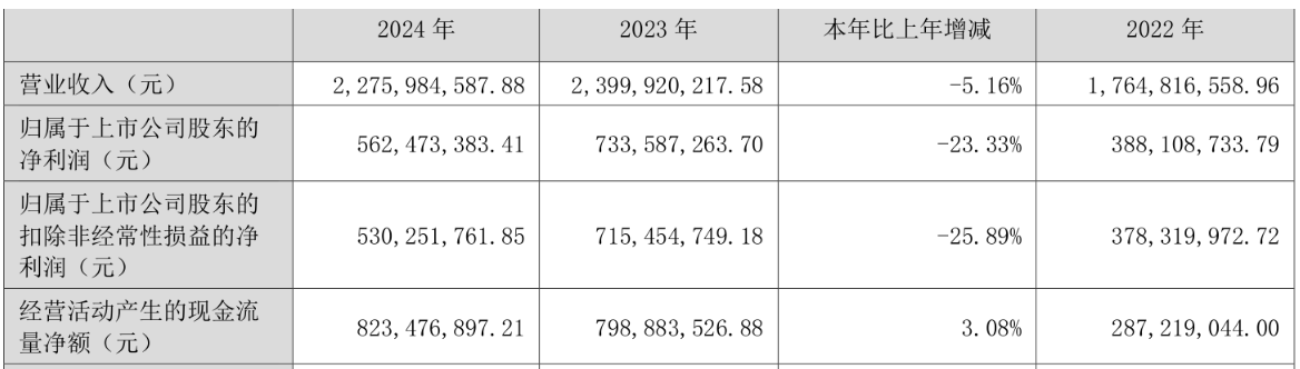 2024年,公司实现营业总收入22.76亿元,同比下降5.16%;归属于上市公司股东的净利润5.62亿元,同比下降23.33%;归属于上市公司股东的扣非净利润5.30亿元,同比下降25.89%;经营活动产生的现金流量净额为8.23亿元,同比增长3.08%。