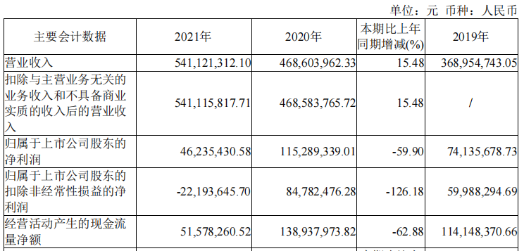 2021年,公司实现营业收入5.41亿元,同比增长15.48%;实现归属于上市公司股东的净利润4623.54万元,同比减少59.90%;实现归属于上市公司股东的扣除非经常性损益的净利润-2219.36万元,同比减少126.18%;经营活动产生的现金流量净额为5157.83万元,同比减少62.88%。