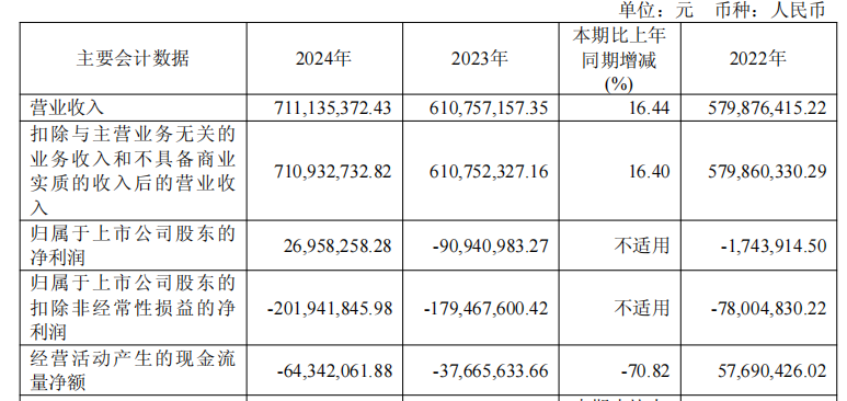 2024年,公司实现营业收入71113.54万元,同比增长16.44%;实现归属于母公司所有者的净利润2695.83万元;归属于母公司所有者的扣除非经常性损益的净利润为-20194.18万元;经营活动产生的现金流量净额为-6434.21万元,上年同期-3766.56万元。