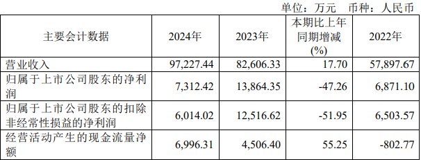 2024年,公司营业收入9.72亿元,同比增长17.70 %;归属于上市公司股东的净利润7,312.42万元,同比减少47.26%;归属于上市公司股东的扣除非经常性损益的净利润6,014.02万元,同比减少51.95%;经营活动产生的现金流量净额6,996.31万元,同比增长55.25%。