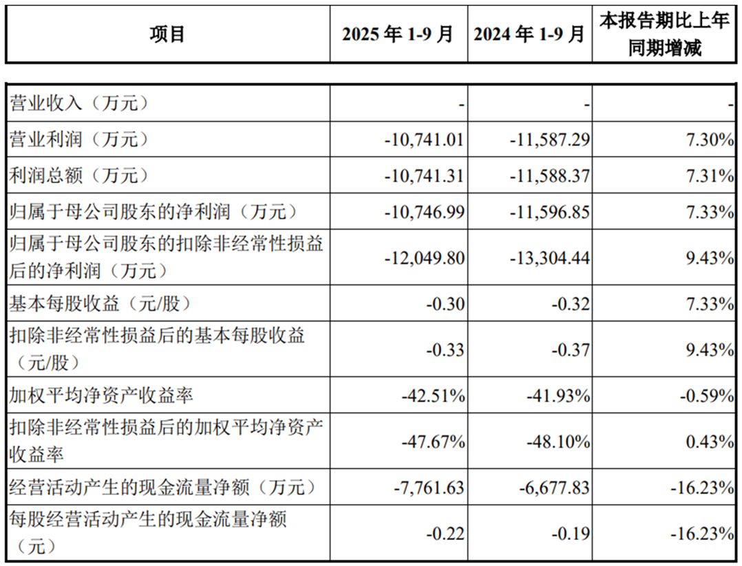 2025年1-9月,公司无营业收入,归属于母公司股东的净利润为-10,746.99万元,上年同期为-11,596.85万元;归属于母公司股东的扣除非经常性损益后的净利润为-12,049.80万元,上年同期为-13,304.44万元;经营活动产生的现金流量净额为-7,761.63万元,上年同期为-6,677.83万元。