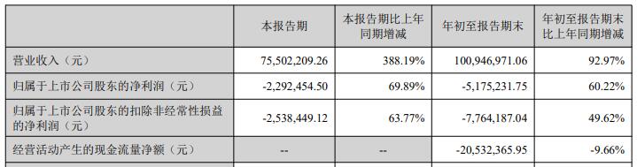 中国经济网北京10月29日讯 *ST清研(301288.SZ)近日公布的2025年三季度报告显示,今年前三季度,公司实现营业收入1.01亿元,同比增长92.97%;归属于上市公司股东的净利润-517.52万元,上年同期为-1301.05万元;归属于上市公司股东的扣除非经常性损益的净利润-776.42万元,上年同期为-1541.14万元;经营活动产生的现金流量净额为-2053.24万元,上年同期为-1872.43万元。
