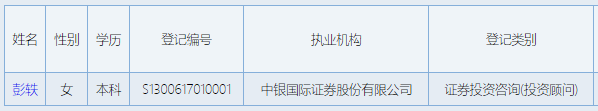 中国证券业协会从业人员基本信息公示显示,彭轶的执业机构为中银证券,登记类别为证券投资咨询(投资顾问),登记日期为2017年1月24日。