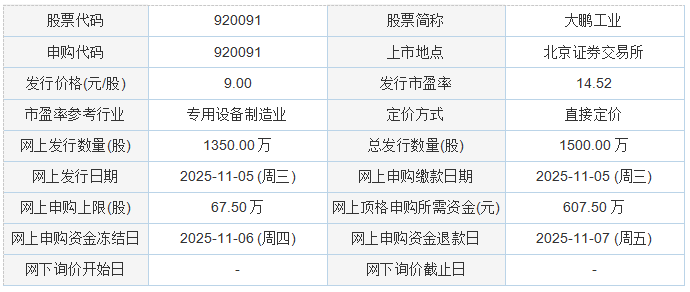 今日申购:大鹏工业
