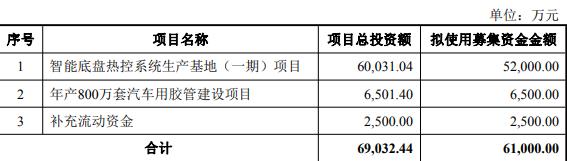 公司本次发行可转债拟募集资金总额不超过61,000.00万元(含),扣除发行费用后,募集资金净额拟投资于智能底盘热控系统生产基地(一期)项目、年产800万套汽车用胶管建设项目、补充流动资金。