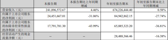 年初至报告期末,公司实现营业收入6.74亿元,同比增长0.58%;归属于上市公司股东的净利润8494.29万元,同比减少27.74%;扣除非经常性损益后的净利润6588.53万元,同比减少36.81%,经营活动产生的现金流量净额2848.84万元,同比减少16.38%。