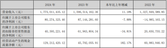 2024年,公司实现营业收入17.75亿元,同比增长11.18%;归属于上市公司股东的净利润8027.43万元,同比减少7.88%;归属于上市公司股东的扣除非经常性损益的净利润4039.52万元,同比减少34.81%;经营活动产生的现金流量净额1.29亿元,同比增长182.17%。