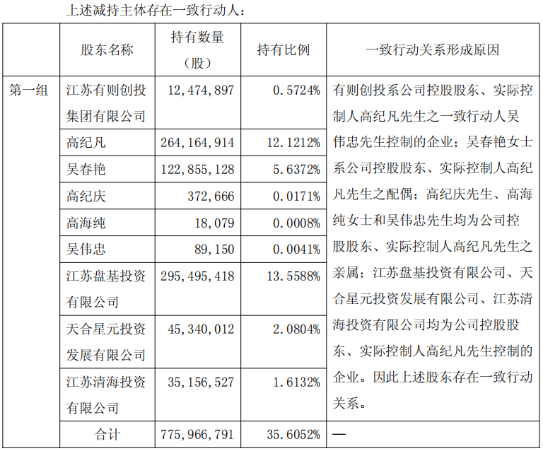 有则创投系公司控股股东、实际控制人高纪凡之一致行动人吴伟忠控制的企业;吴春艳系公司控股股东、实际控制人高纪凡之配偶;高纪庆、高海纯和吴伟忠均为公司控股股东、实际控制人高纪凡之亲属;江苏盘基投资有限公司、天合星元投资发展有限公司、江苏清海投资有限公司均为公司控股股东、实际控制人高纪凡控制的企业。因此上述股东存在一致行动关系。