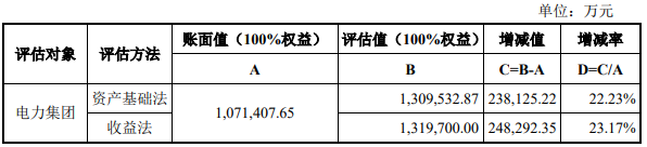 安徽中联国信依照国家评估相关法律法规,就标的资产截至2024年11月30日的全部权益价值进行了评估。本次评估采用资产基础法和收益法。本次交易选用资产基础法评估结果作为最终评估结论,即标的公司电力集团的股东全部权益价值为1,309,532.87万元。上述评估结果已经淮河控股核准。