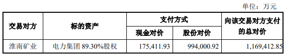 淮河能源10月30日发布的《发行股份及支付现金购买资产暨关联交易报告书(草案)(上会稿)》显示,本次交易方案为上市公司通过发行股份及支付现金的方式购买淮南矿业持有的电力集团89.30%股权。本次重组交易方案较预案所披露的方案取消了募集配套资金,故本次交易不涉及募集配套资金。