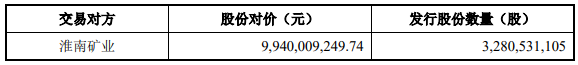 根据本次交易标的资产的交易作价、本次发行股份的价格及股份支付的比例,上市公司本次发行股份购买资产的股份发行数量为3,280,531,105股,向交易对方淮南矿业发行股份的情况如下: